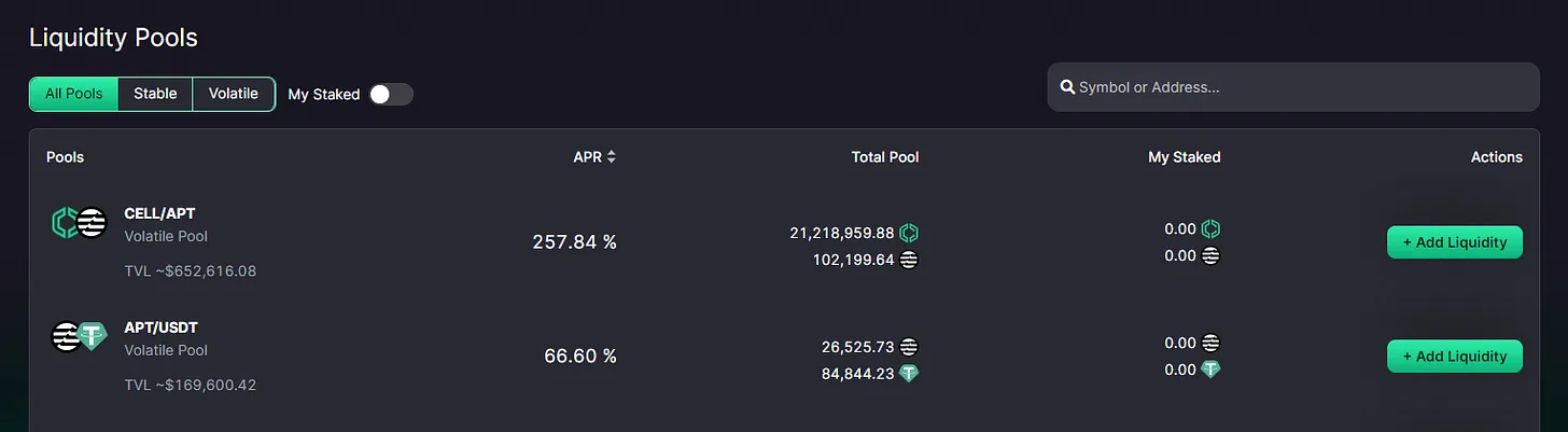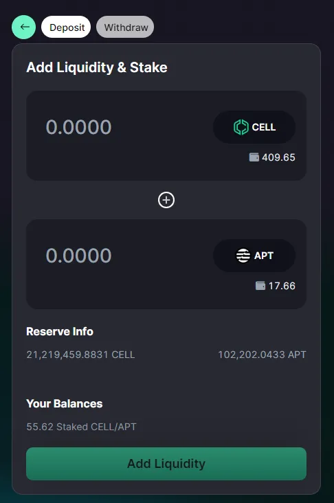 Users can provide liquidity to Cellana liquidity pools in exchange for LP tokens and stake LP tokens in the gauges that make users eligible for CELL emissions.