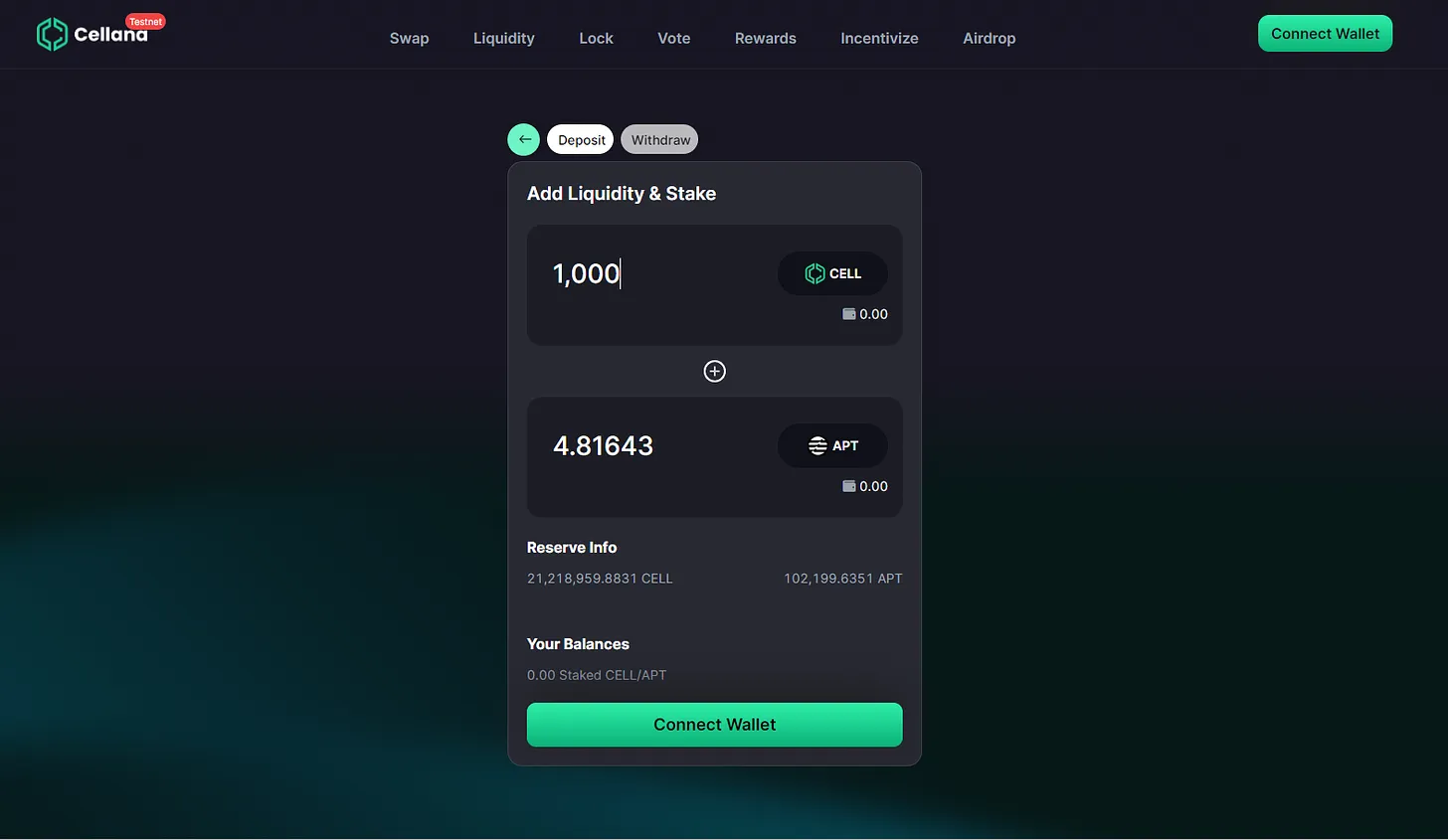 **Step 1**: Connect your Aptos wallet to Cellana: <https://cellana.finance/>
