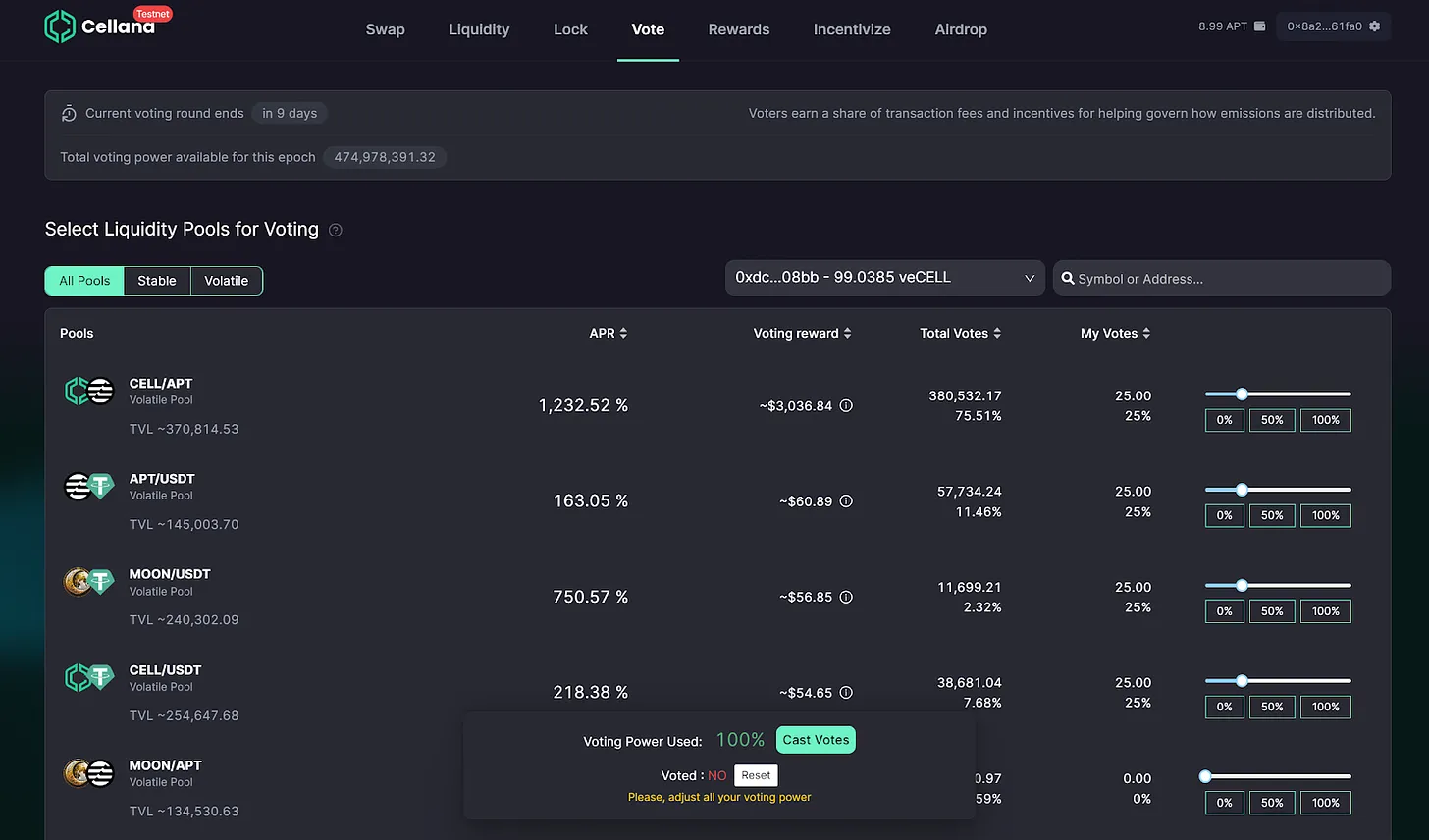 Visit[ https://cellana.finance/vote](https://testnet.cellana.finance/vote) and then vote on your pair(s) of choice. Hit the "Cast Vote" button and confirm the transaction.