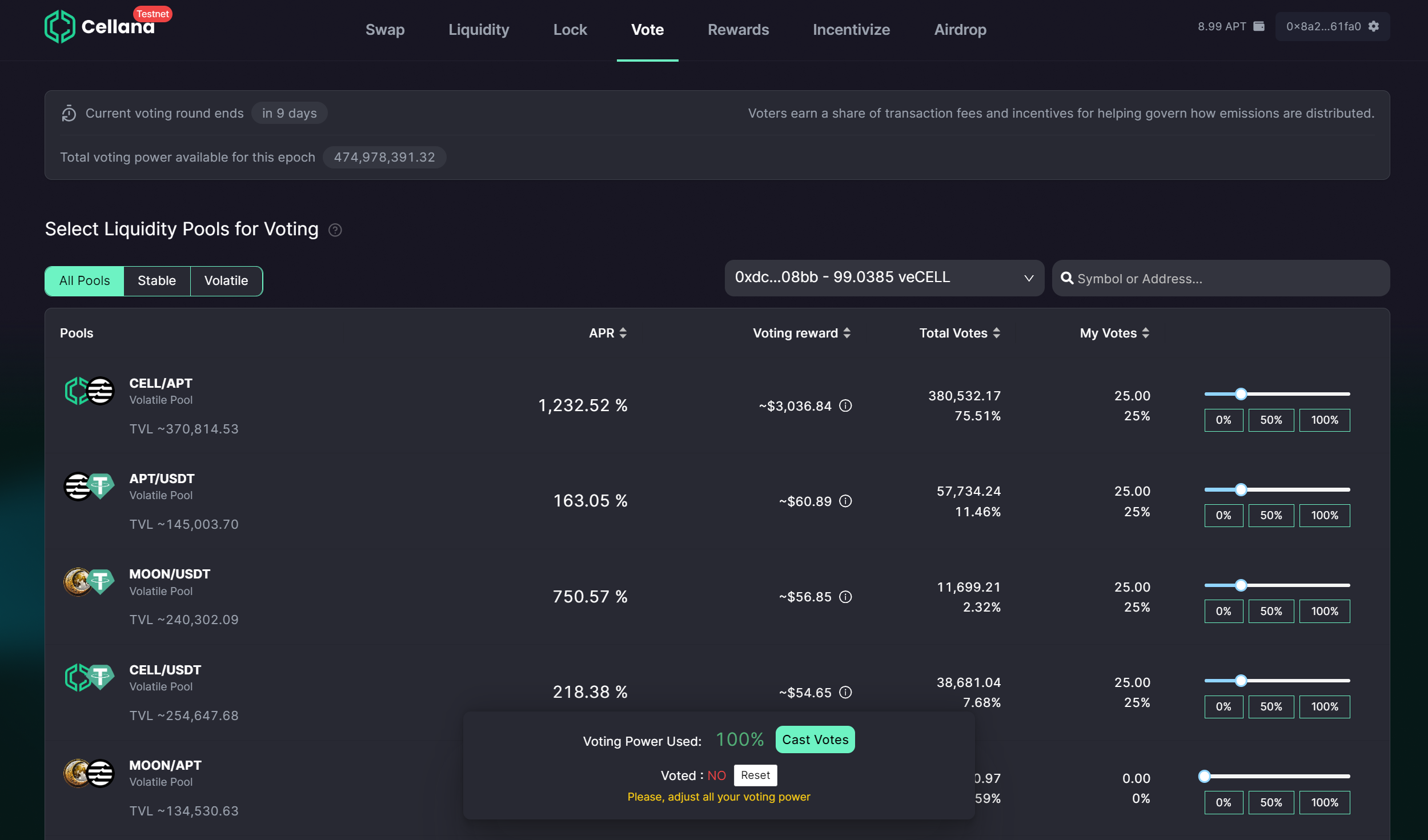After users exchange their CELL for veCELL through the lock function, they gain voting power to participate in LP voting rounds. Each voting round, lasting 7 days (1 epoch), enables veCELL voters to receive a share of trading fees and any additional incentives determined by their weighted voting power across voted LPs.